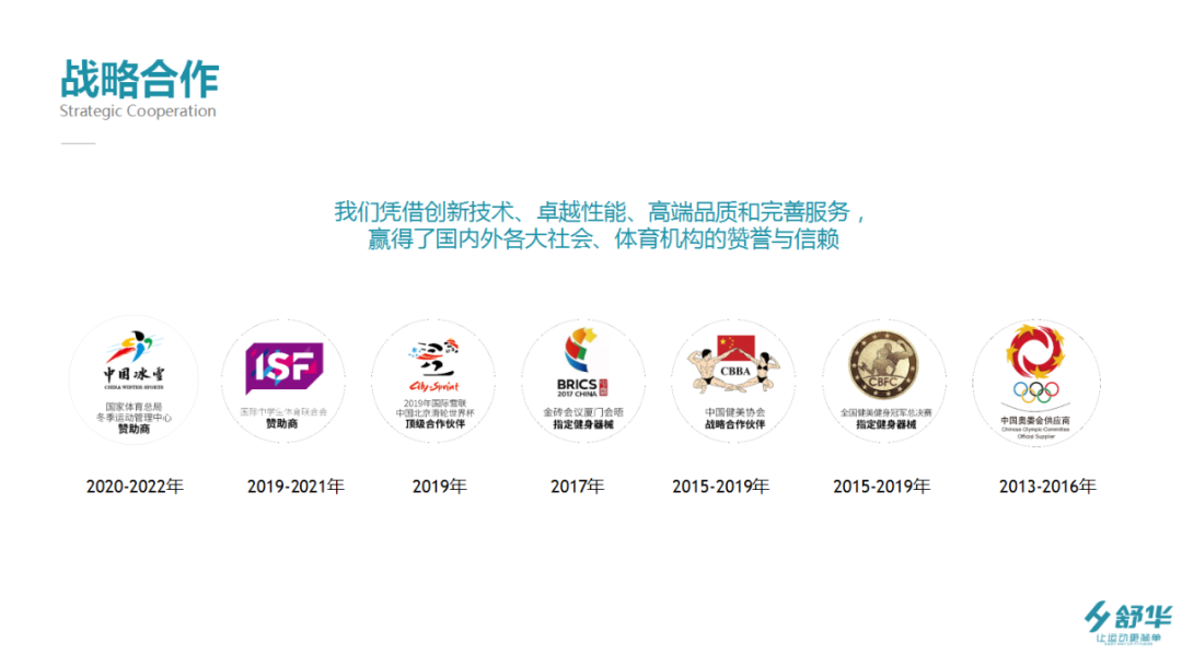 2019年,舒華與國家體育總局冬季運動管理中心合作,成為國際雪聯中國北京滑輪世界杯頂級合作伙伴,入駐國家體育總局冬運中心“泰皇島”及“首鋼園”訓練基地體能館并成為體能大比武活動贊助商。云南騰沖啟迪雙創冰雪小鎮,西南最大室內冰雪館,也有舒華室內體能館。