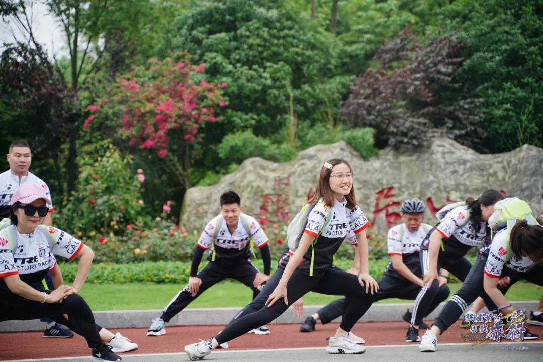 在正式騎行之前,必要的熱身運動肯定少不了,同時教練還細致的講了騎行姿勢、檔位和注意事項等。說到運動,我們友杰人可是認真的,大家都一絲不茍的做著熱身活動,畢竟一會的比賽可是有大獎的,大家都憋著一股勁呢!