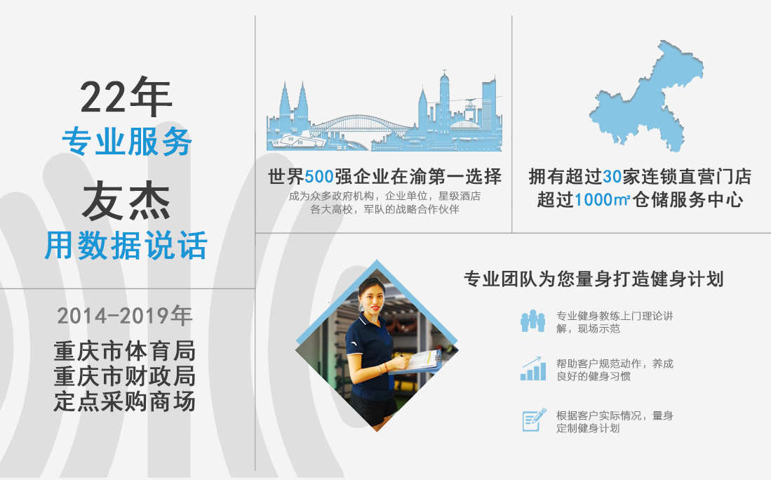 圍繞“全面智能 、全民健康”的主題,友杰體育的業務范疇囊括家庭健身、商用健身、全民健身、校園體育、場地場館、專業體能六大領域,精心構建全場景、全人群、全智能的運動藍圖。秉持“超越客戶預期”的服務準則,友杰堅守企業與客戶、員工、行業協同共進的理念,持續發展壯大,連續多年榮膺重慶市場占有率及銷售額雙冠的高端健身設備與體育設施供應商殊榮,并先后獲得“重慶市優秀體育企業”、“重慶市體育局、財政局定點采購單位”、“重慶市體育產業示范單位”、“政采云優選品牌供應商”等諸多榮譽。